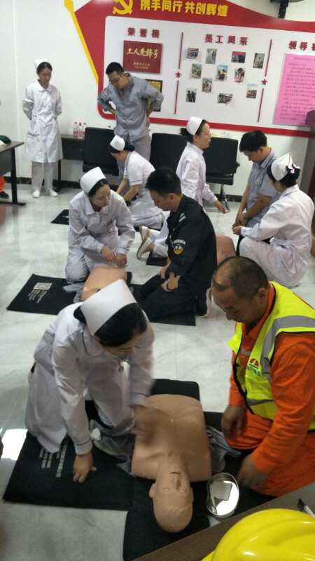 在活动现场,由护理专业教师党员讲解单人徒手心肺复苏术的操作方法和注意事项,普及急救常识;并结合厂区户外作业特点,讲解了外伤包扎的技术。讲解结束后指导参加活动的职工进行现场模拟急救,工人们学习兴趣浓厚,纷纷主动进行实践操作,掌握了自救互救的基本知识与技能。