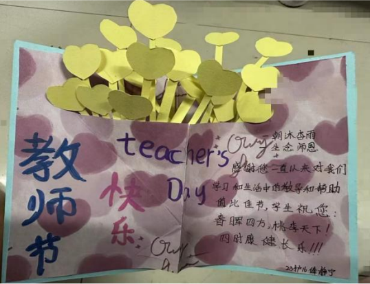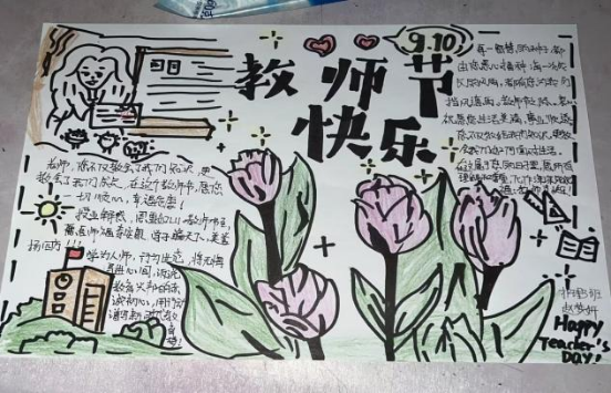 活动中,同学们积极参与教师节贺卡和手抄报的制作,作品各具特色,采用图文结合的方式,表达了对自己老师的祝福和对教师职业的赞美。活动的开展,锻炼了同学们的动手能力,展现了同学们多才多艺的风采,也让同学们体会了感念师恩和心中有爱,弘扬了尊师重道的传统美德。