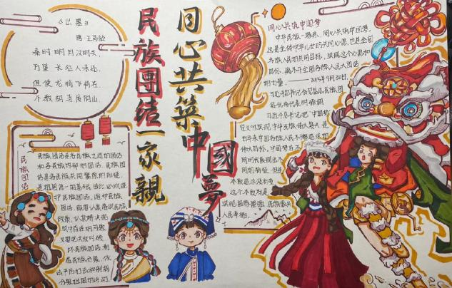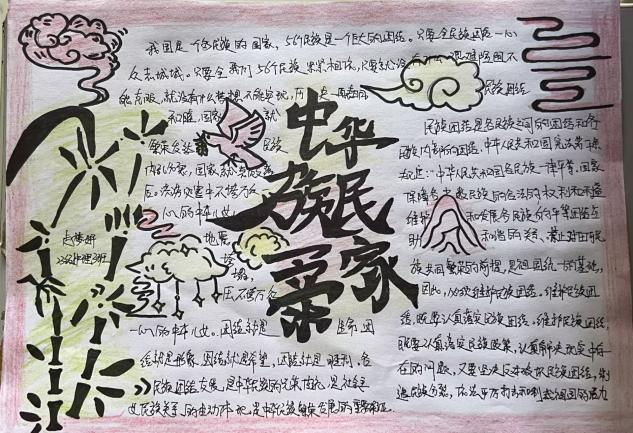 活动中,同学们通过搜集素材剪辑创意小视频、绘制手抄报、游览主题公园等多种形式进行了一次全面的民族文化教育,展现了56个民族一家亲,各族人民和谐共建的美好画面。让同学们对不同民族的风俗习惯、文化背景有了深刻的理解及认识,意识到各民族血脉相融、信念相同、文化相通、经济相依、情感相亲,中华民族共同体的形成和发展是人心所向、大势所趋、历史必然。活动最后,同学们纷纷表示要做铸牢中华民族共同体意识的坚定拥护者、有力宣传者和忠实践行者,并由衷地祝福祖国母亲和平统一、繁荣昌盛。