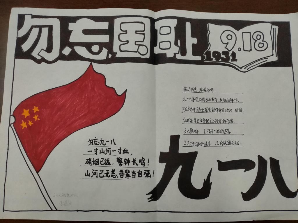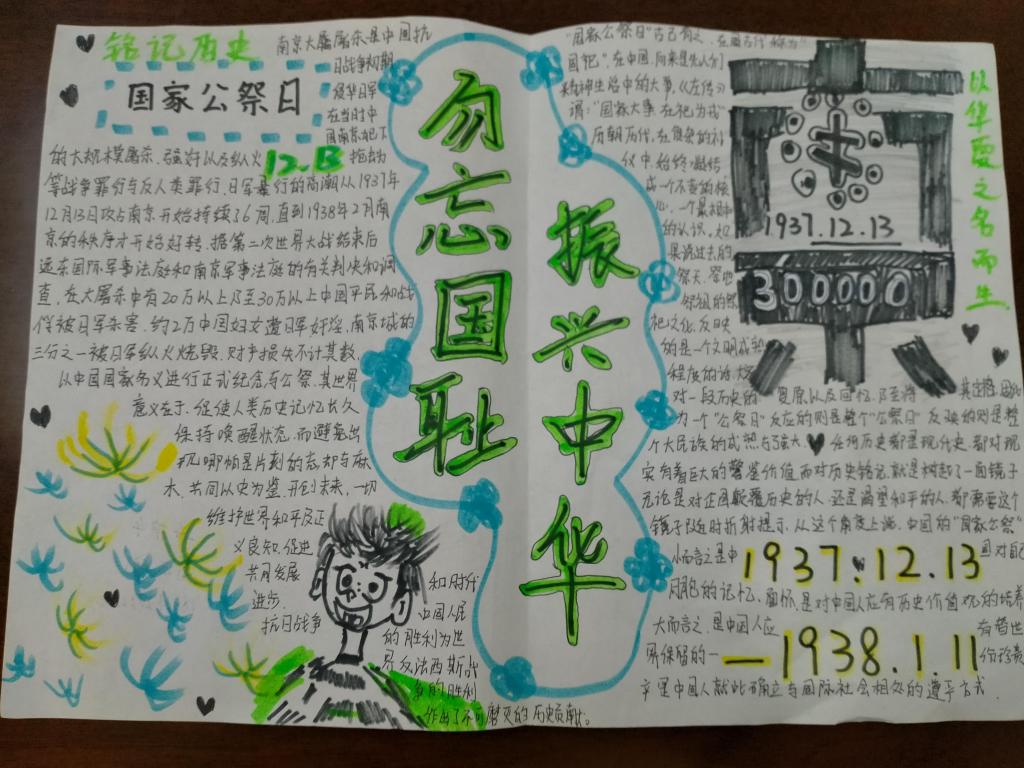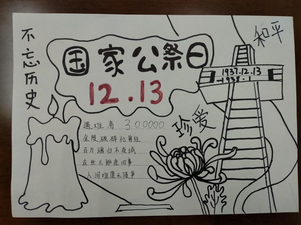 在一张张手抄报里同学们穿过时间的洪流,看到了曾经苦难的中华民族,了解了受压迫的屈辱历史,以画笔为武器,用精湛的画艺描绘出对南京大屠杀历史的理解与感悟,慷锵有力的文字书写出对和平的向往以及对祖国未来的美好憧憬。