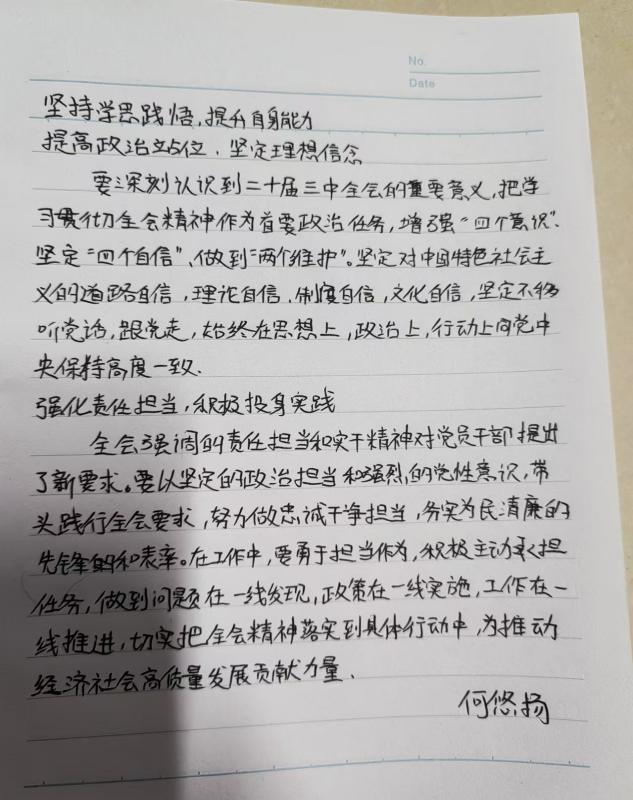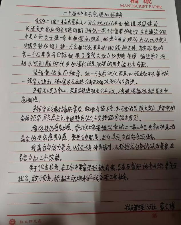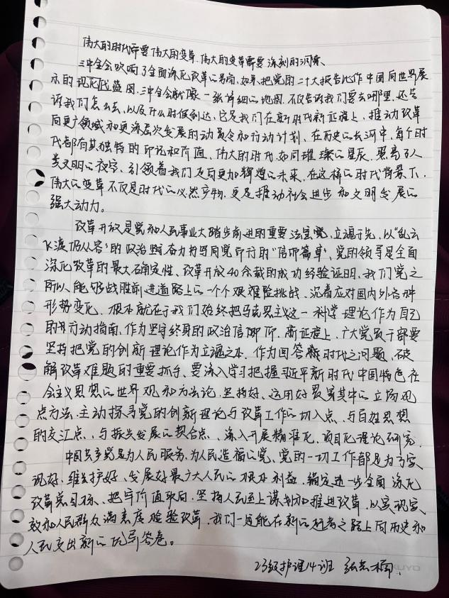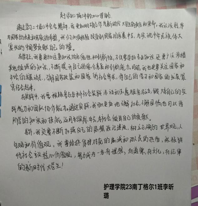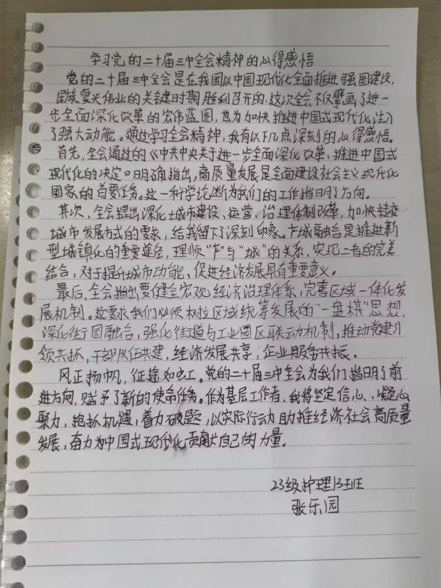 党课伊始,党支部书记强调了党的二十届三中全会的重大意义,是在以中国式现代化全面推进强国建设、民族复兴伟业的关键时期召开的一次十分重要的会议,对全会通过的《中共中央关于进一步全面深化改革、推进中国式现代化的决定》进行了深入解读,阐述了进一步全面深化改革的鲜明主题、总目标、重大原则和重大举措等内容,使同学们深刻认识到改革对于推动我国发展的关键作用。课上,同学们认真聆听,仔细记录。积极进行小组讨论发言。党课结束后,同学们认真撰写心得体会,表示使自己明确了新时代的责任担当。