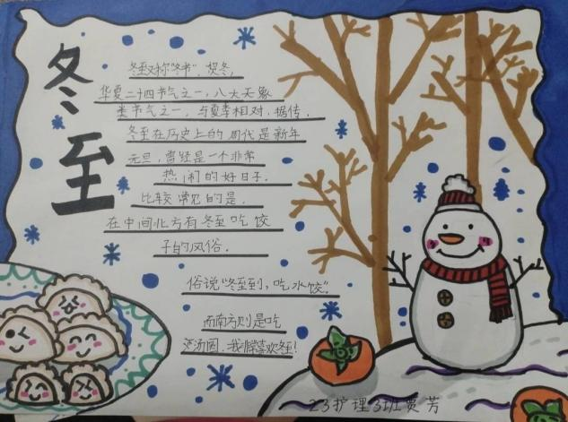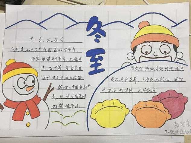 天气向寒,人心向暖,冬至,一个蕴含深厚文化底蕴且充满烟火气息的节气,标志着一年中最寒冷的时节已经到来,同时也寓意着团员温暖与希望,同学们积极参与活动,热情响应。一幅幅精美的手抄报,一盘盘热气腾腾的饺子,同学们将对传统文化的热爱融入一笔一画中,而饺子盛宴将活动氛围推向高潮。温馨的氛围感染着每一个人,并使同学们对中华文化有了更全面、更深刻的理解,同时增强了文化自信和民族自豪感,激发同学们传承和弘扬优秀传统文化的责任感与使命感。