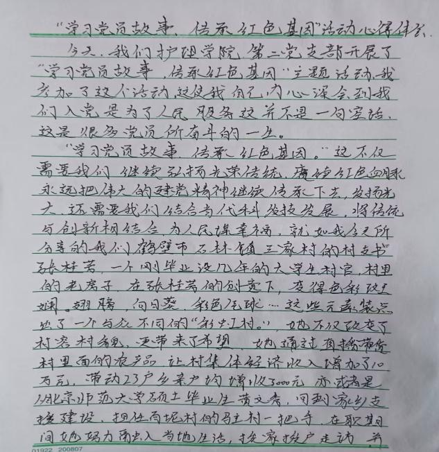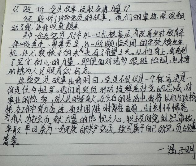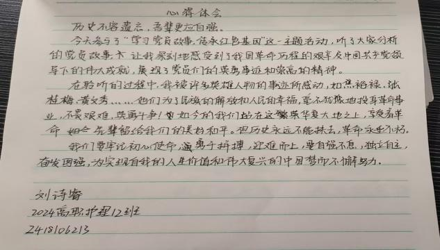 活动伊始,同学们逐个讲述红色故事,这些故事涵盖了革命战争时期、新中国建设时期以及改革开放以来的各个阶段,故事生动地展现了老党员用实际行动诠释共产党员的初心与使命、坚定的理想信念、无私奉献的精神和为人民服务宗旨。讲述结束后,同学们结合个人学习和生活实际,分享了体会和感悟,并用文字记录对红色精神、红色基因的新认识和新理解。同学们表示,通过聆听老党员的红色故事,深刻感受到共产党员的崇高精神品质,并将以他们为学习榜样,努力学习知识技能,提高自身专业素质和能力,为实现中华民族伟大复兴的中国梦贡献力量。