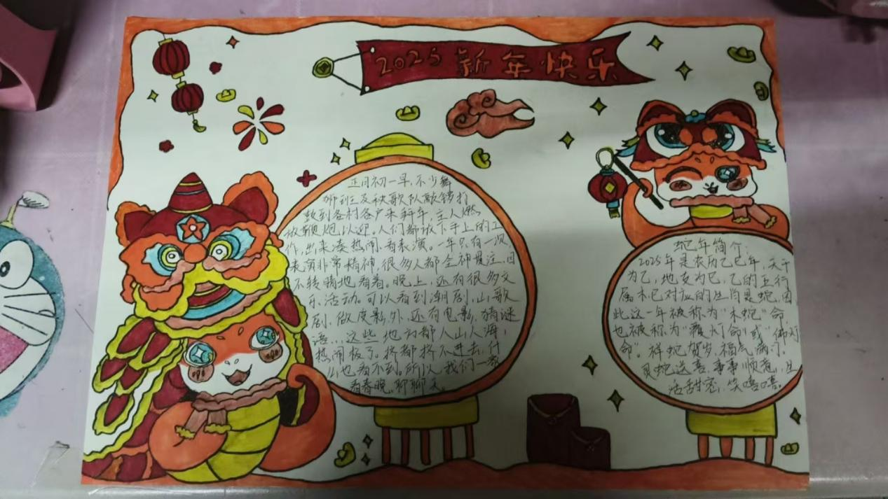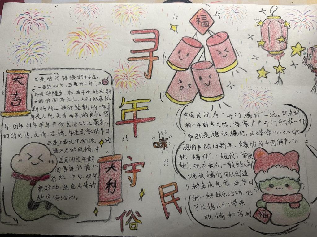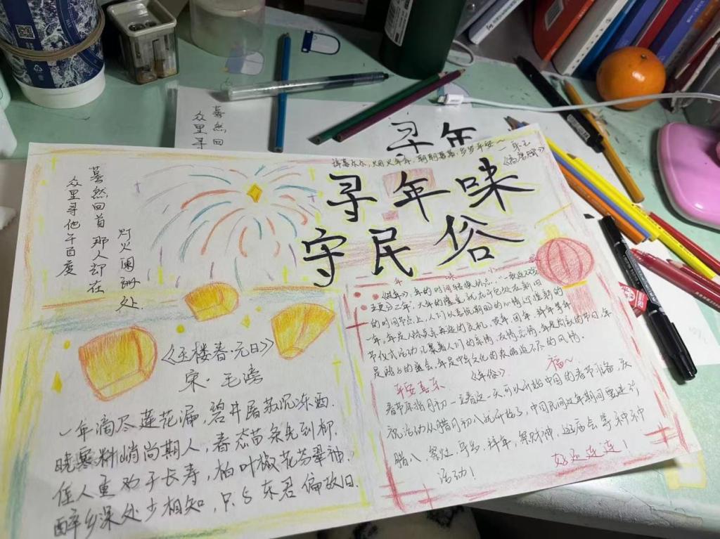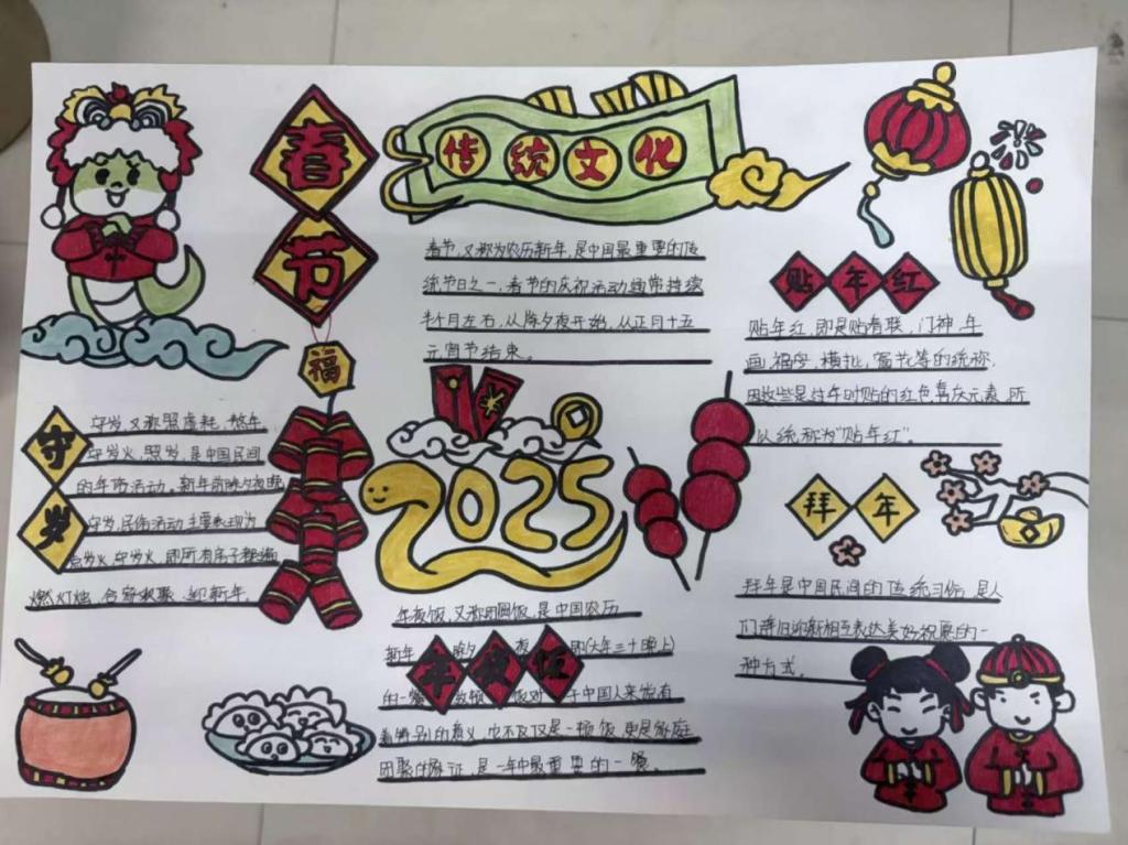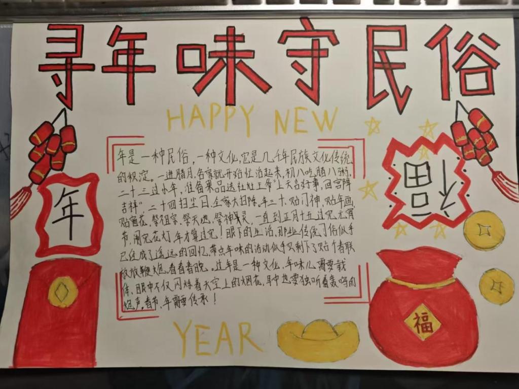 活动期间,同学们深入挖掘腊月里的传统习俗,从腊月初八的腊八粥飘香,到腊月二十三的糖瓜祭灶,再到除夕守岁的阖家团圆,将丰富的文化内涵凝于笔端,绘于纸上。大家巧妙构思,精心设计,一幅幅手抄报色彩斑斓、创意无限,生动呈现了腊月的独特魅力与喜庆氛围。