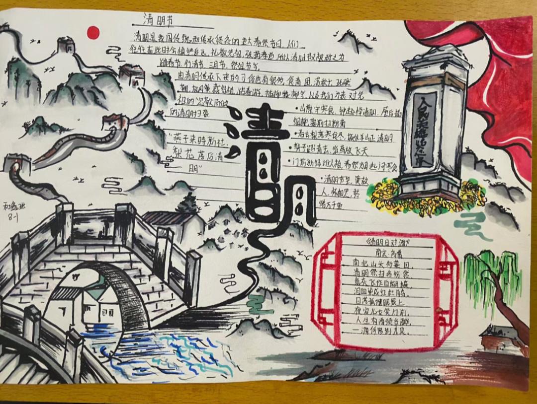 为弘扬中华优秀传统文化,坚定文化自信,激发青年一代热爱传统文化、创新继承传统文化,党支部组织开展绘制“清明节”手抄报主题活动,缅怀先辈,传承文明。在清明节这一天,同学们用手中的画笔描绘出英烈的光辉形象,让他们的精神永存于我们的心中;用画笔绘制“草长莺飞,春和景明”的春游踏青美景,不忘先辈先烈,不负如愿盛世。
