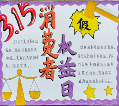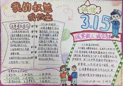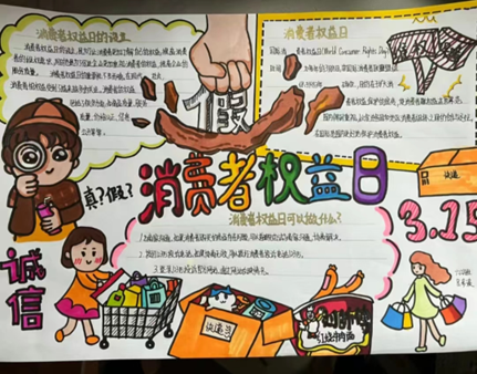 活动中,同学们通过绘制“我的权益我做主”“保障权益·畅通消费”手抄报,拍摄《消费者权益保护法》相关普法宣传短视频,增进对“国际消费者权益日”了解,用创意的想法,生动的画面,幽默的语言,倡导人们正确合理的消费观念。再结合自己生活中的典型事例,通过分享真实感悟和心得体会,在寓教于乐的氛围中学习和传播相关法律知识,提高了维权意识。