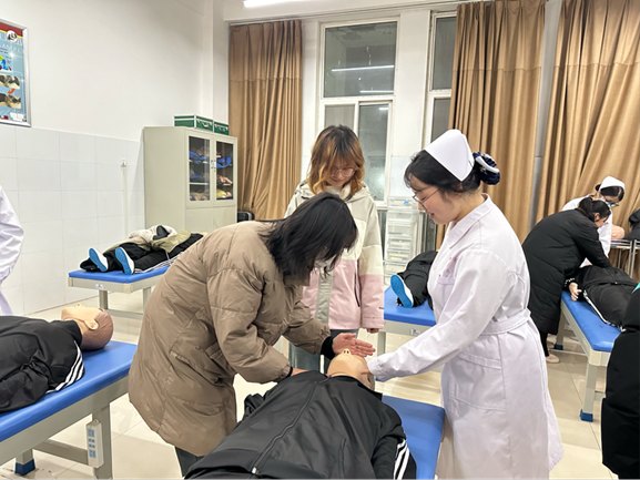 培训过程由党员教师魏瑞琴老师带领急救小分队成员以急救理论授课、观看操作视频、急救技能操作示范、分组实操练习的教学方式进行。培训中,急救小分队为大家深入浅出地讲授心肺复苏及AED的操作、气道异物梗阻施救、创伤止血包扎的操作流程。随后,魏老师阐述了“心肺复苏”在抢救心搏呼吸骤停患者时的重要意义及时效性,并通过人体模型详细演示了体位摆放、胸外心脏按压定位、按压手法等操作要点,同时就AED除颤、海姆立克急救法、止血包扎等实操技能的注意事项逐一进行了规范指导,最后指出培训结束考核合格者将发放培训证书,大大激发了学员的学习兴趣,提升了培训效果。