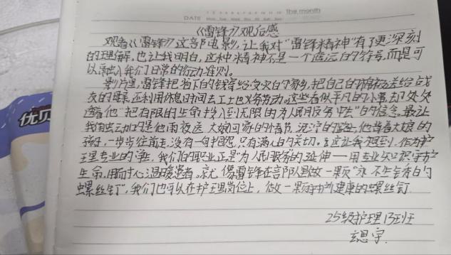 此次活动,以“观影+撰文”的灵活形式,打破时空限制,让雷锋精神在假期学习生活中持续浸润。通过观看影片,员工们进一步理解了雷锋精神的核心内涵,明晰了作为护理专业学子,将雷锋精神与救死扶伤的职业信念相结合的责任,要用青春力量诠释雷锋精神的时代新义,为健康中国建设贡献智慧与担当。
