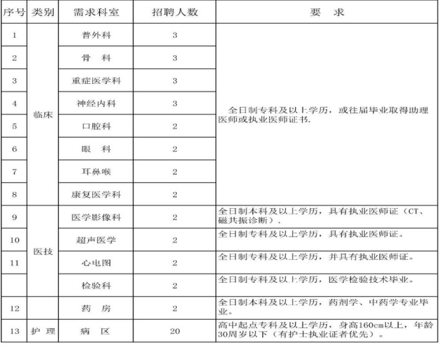 为满足医院发展需要,特面向社会公开招聘2022届或往届优秀医疗、护理、技术等毕业生,具体招聘事宜如下:招聘岗位 本次面向社会共招聘工作人员50人名。具体专业、人数要求为: